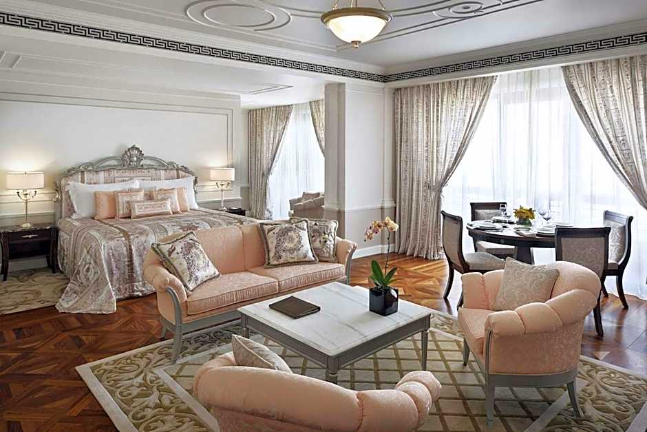 The spacious, bright and elegant suite offers a living area with a large flat screen TV and dining area. The bedroom offers a king-size bed. Opposite of the bed lies a 55 inch flat-screen TV and on the side table is an in-room control panel where you can change the lighting, open/close curtains, listen to radio though a touch. There is a work desk with media connectivity panel. The room has a big walk-in closet with an iron. There is a mini-bar in the room, with complimentary water bottles and tea and coffee making facilities. The bathroom offers a separate rainforest shower and large bath tub and complimentary Versace toiletries.