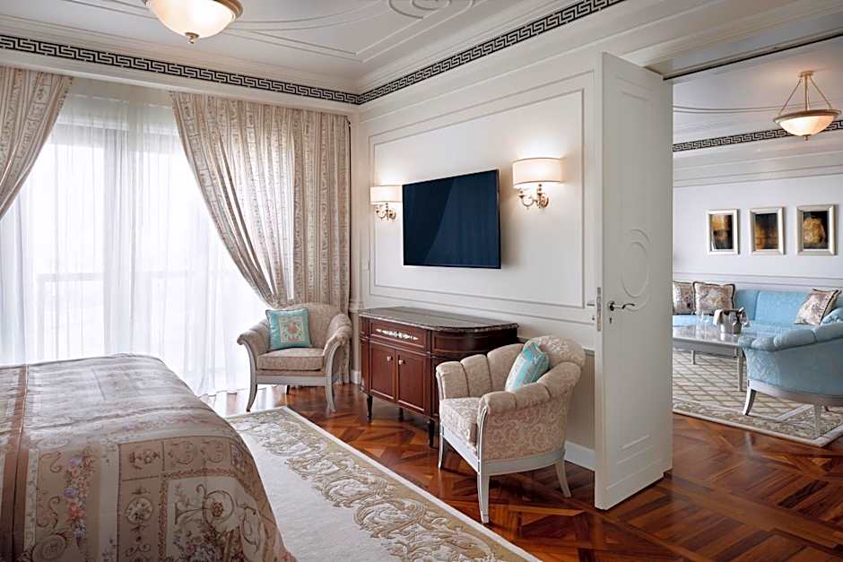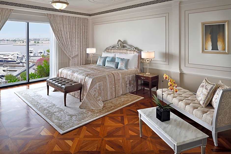 Spacious, bright and elegant, these spacious 130 sqm suites offer a separate living room with a large flat screen TV and dining area. The bedroom offers a King size bed. Opposite of the bed lies a 55 inch flat-screen TV and on the side table is an in-room control panel where you can change the lighting, open/close curtains, listen to radio though a touch. There is a work desk with media connectivity panel. The room has a big walk-in closet with an iron. There is a mini-bar in the room, with complimentary water bottles and tea and coffee making facilities. The bathroom offers a separate rainforest shower and large bath tub and complimentary Versace toiletries.