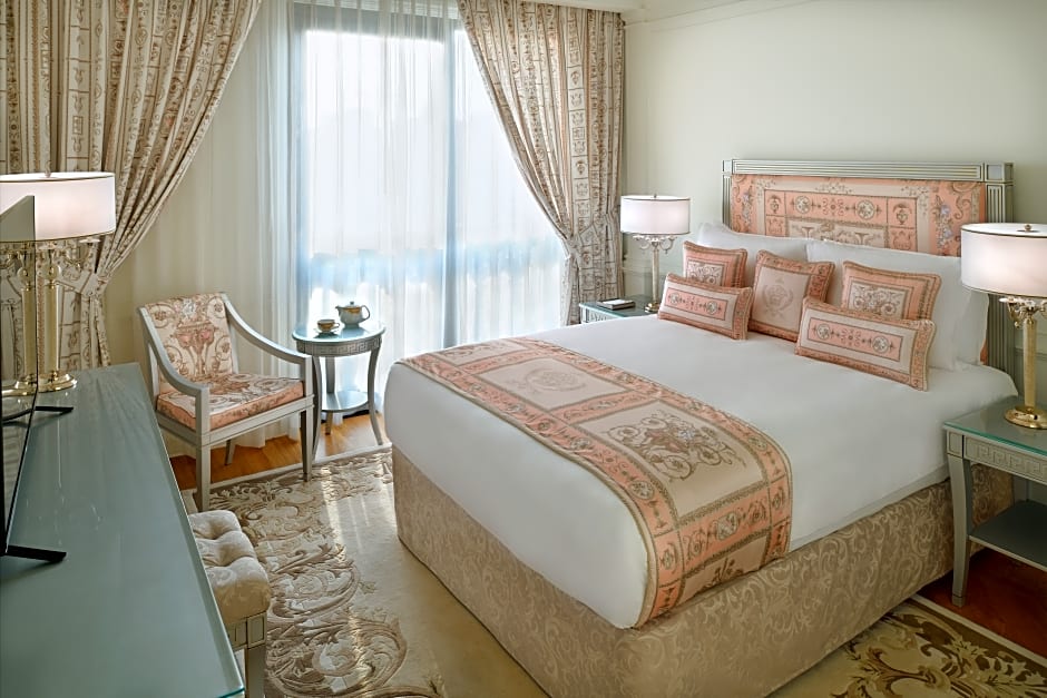 Spacious, bright and elegant, these richly-appointed 52sqm rooms and offer either a King size bed or 2 Queen sized beds. Opposite of the bed lies a 55 inch flat-screen TV and on the side table is an in-room control panel where you can change the lighting, open/close curtains, listen to radio though a touch. There is a work desk with media connectivity panel. The room has a big walk-in closet with an iron. There is a mini-bar in the room, with complimentary water bottles and tea and coffee making facilities. The bathroom offers a separate rainforest shower and large bath tub and complimentary Versace toiletries. Interconnected rooms are available.